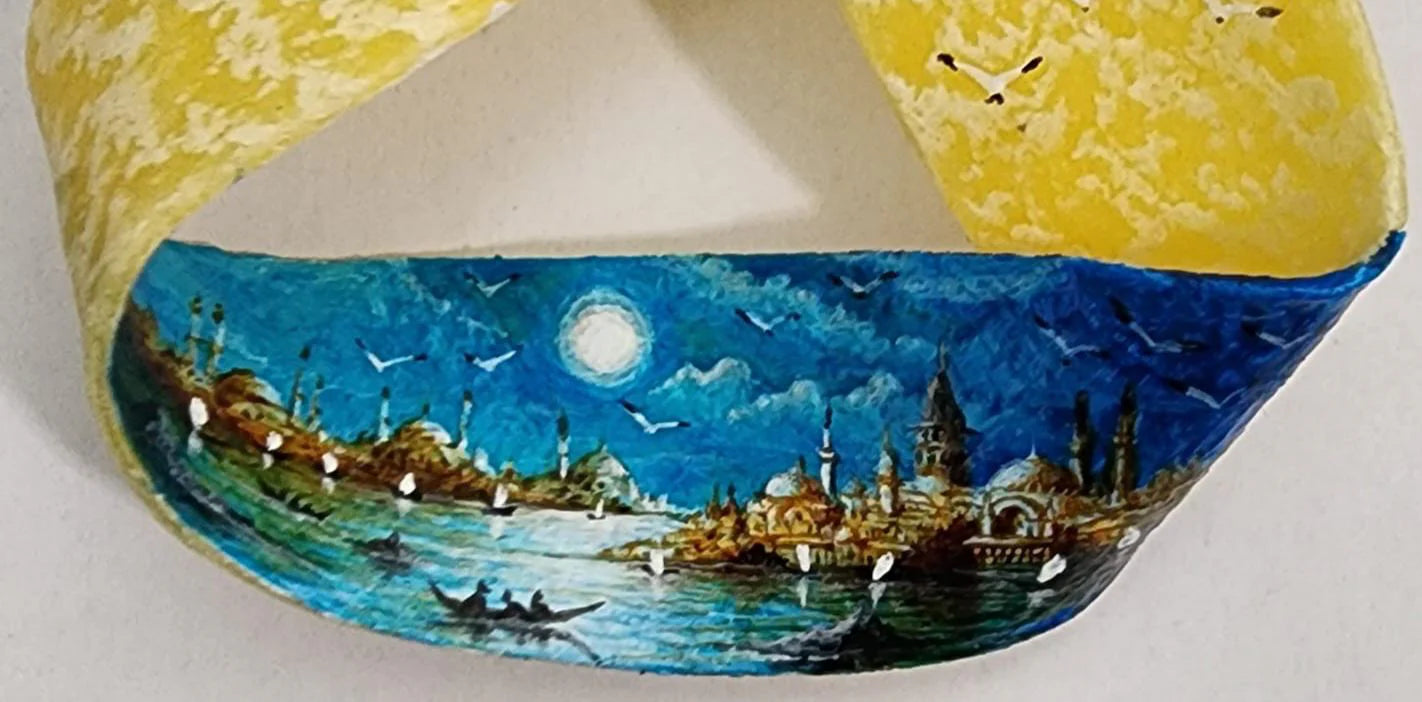 Besides micro-paintings, it is possible to observe miniature-drawing techniques’ tracks in his bigger canvases. In the paintings, he creates imageries with a miniature genre. The artist claims the essence of the aesthetics in art, with a detail-oriented look. His use of light reveals the romantic attempts of his art view. As a point of view, he feels more close to neo-classic and neo-orientalist art movements. As a miniature master who was interested in every branch of painting, he brought the art of miniature to new formations in the 80s, learned the agility of the brush from Mehmet Siyah Kalem, the color and harmony from Levni, and the delicacy of sultan portraits from Nakkaş Osman.28 years passed with an interesting philosophy, in his own words, "My goal is to open different windows to objects that we have not seen, ignored and sometimes called garbage, bringing different perspectives to them and to enable a brand-new spoken language to start all over the world.